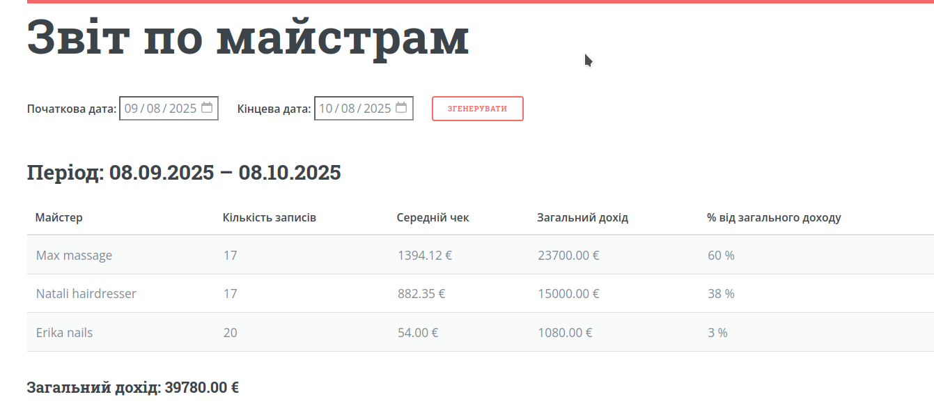 Analyze your financial reports broken down by masters, services, and clients. This helps you understand which services to expand, which masters generate the most income, and who your most loyal clients are.