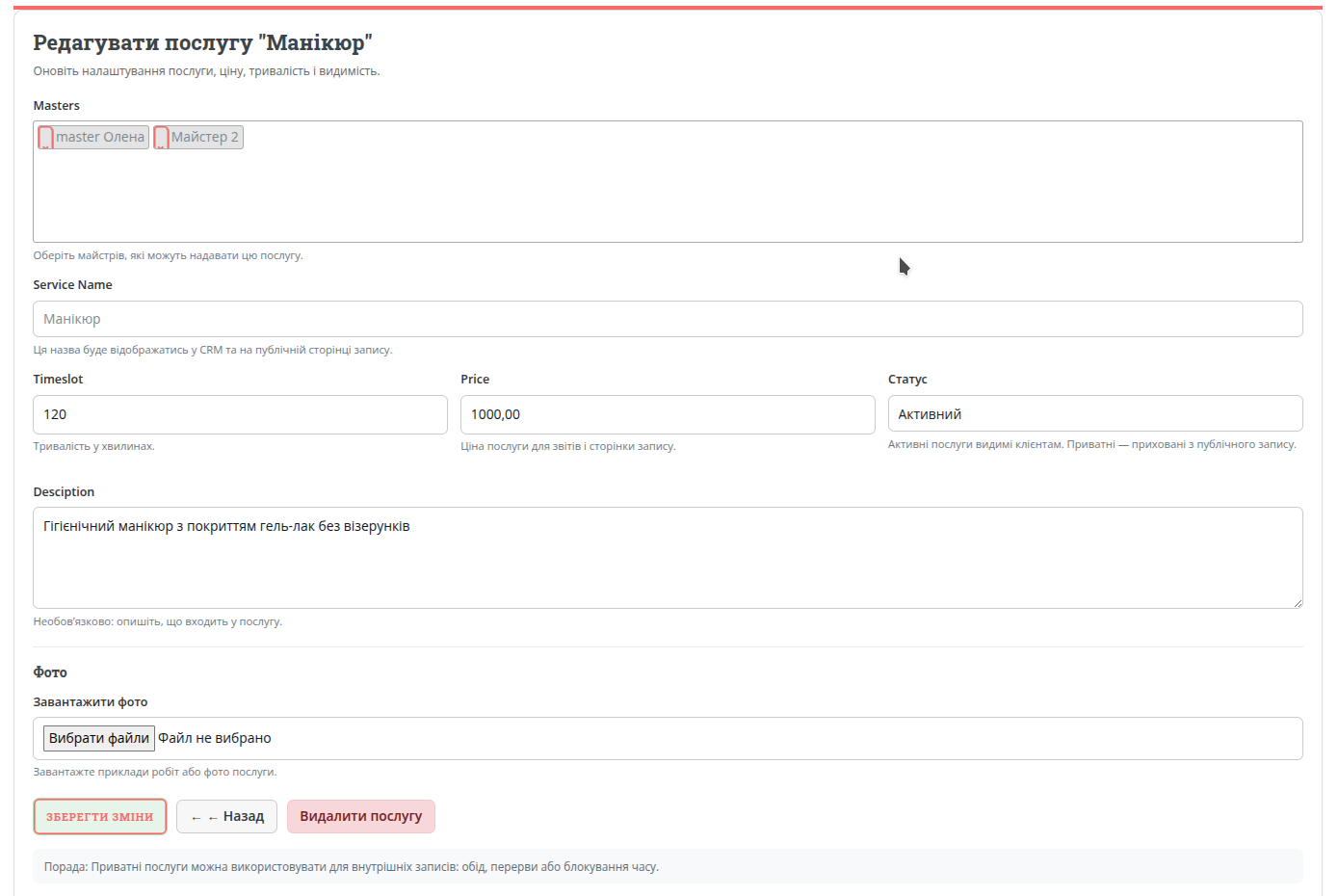 Inserisci un nome chiaro. Ad esempio: “Manicure”, “Manicure senza smalto”, “Consulenza”.