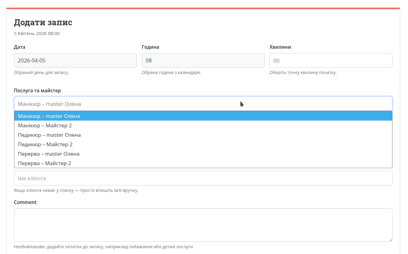 W formularzu wybierz parę usługa + specjalista. Dzięki temu system wie, kto wykonuje usługę i jak wyświetlić ją w kalendarzu.